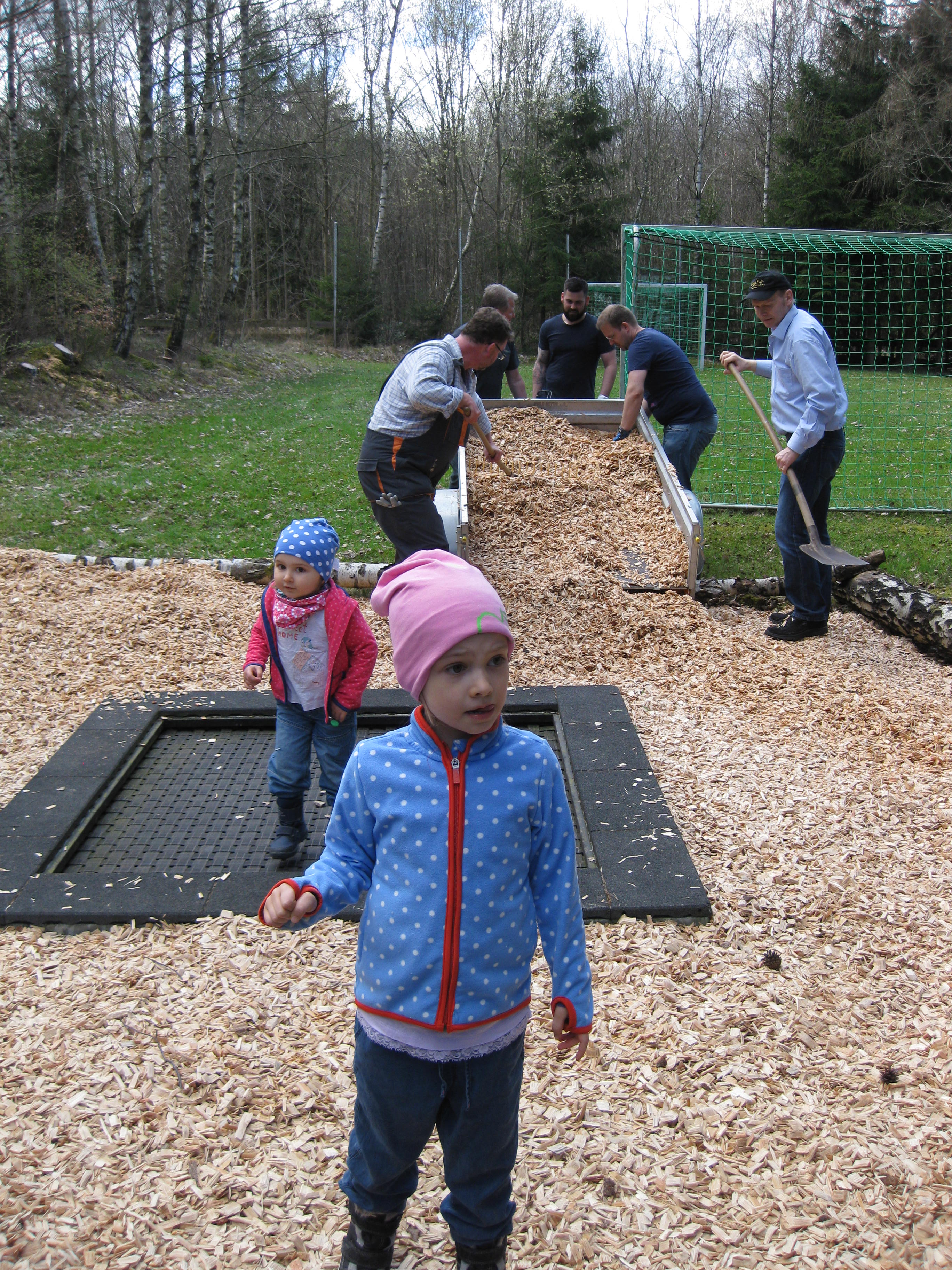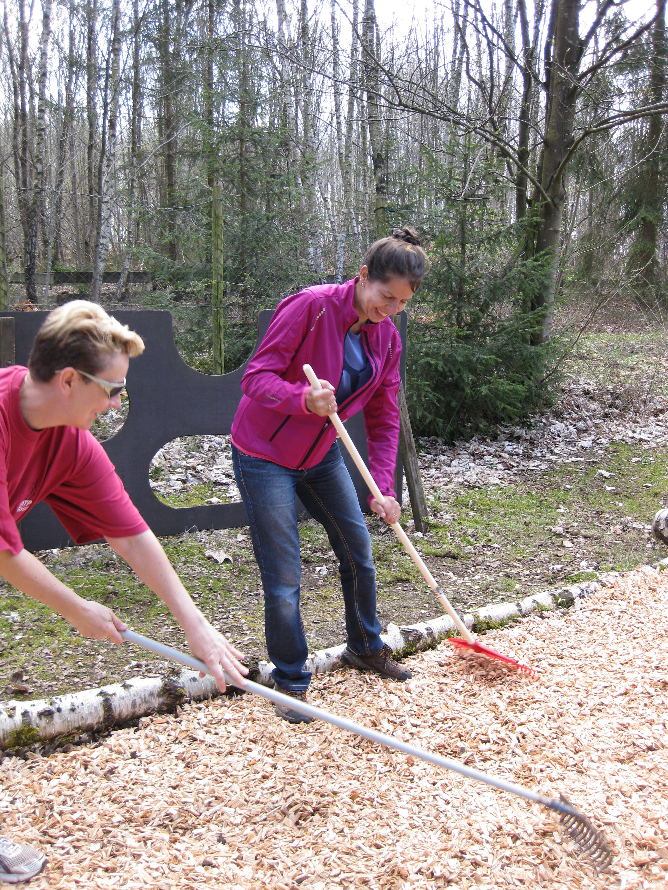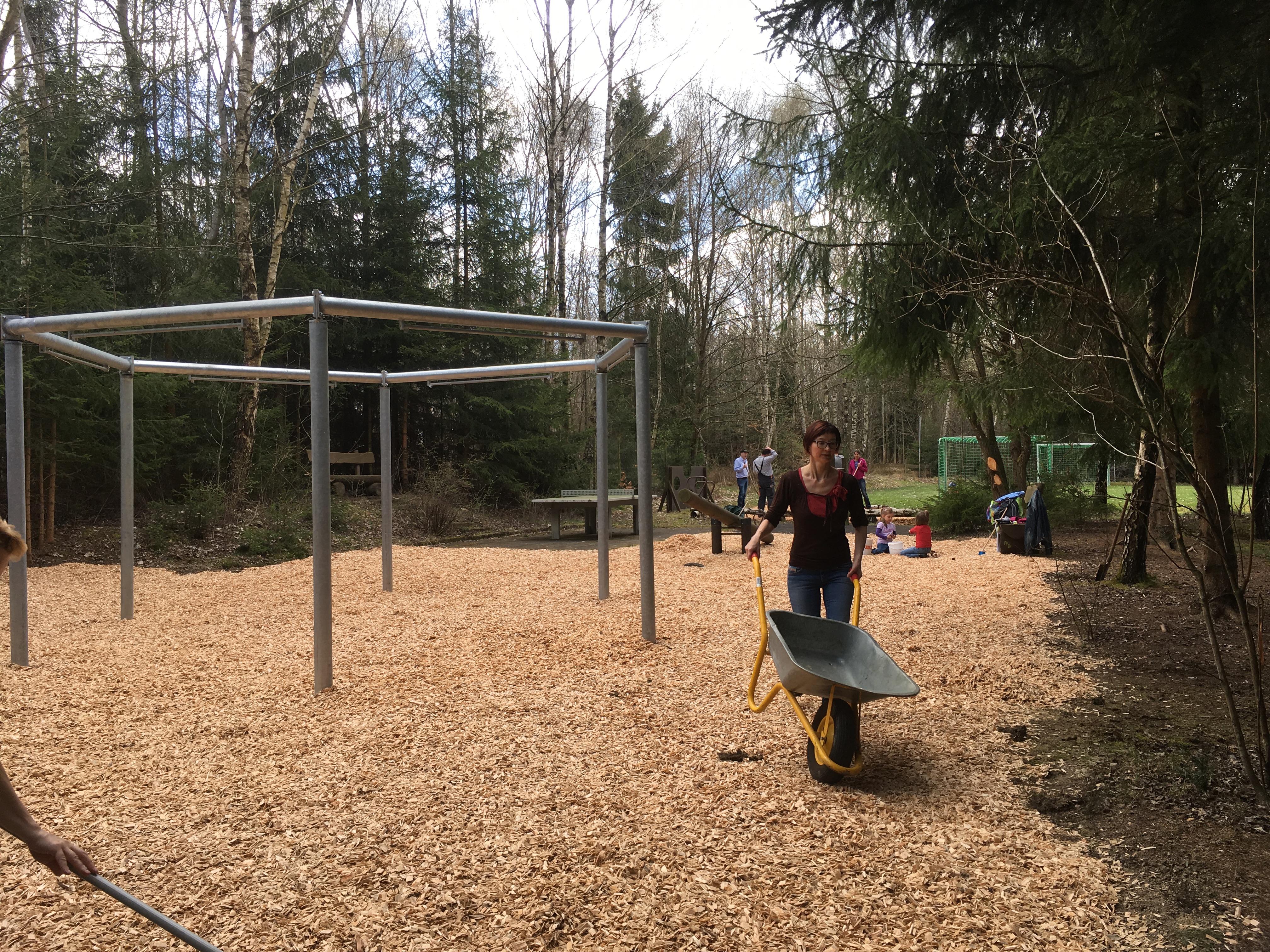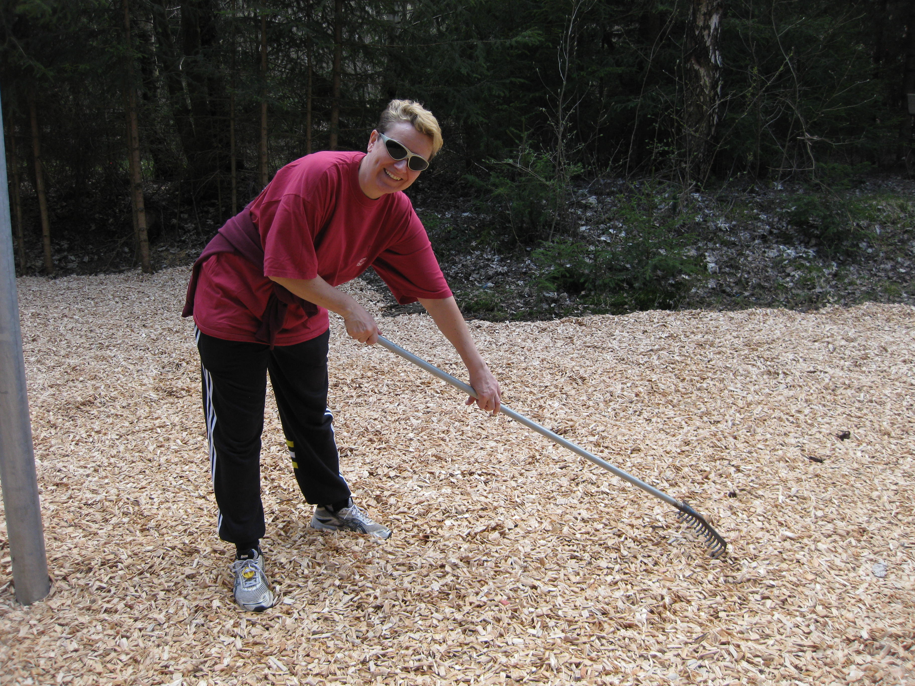 An diesem Tag wurde das Gelände auf die bevorstehende Saison vorbereitet: zu groß gewordene Hecken wurden zurückgeschnitten, die Terrassen wurden gereinigt und ein "großer Berg Holz-Schnitzel" wurde als Fallschutz rund um bzw. unter den Spielgeräten verteilt.