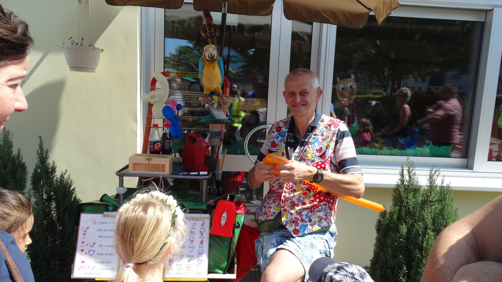 Der Ballonkünstler Michael Kullmann verzauberte die Kinder mit wunderschönen Ballonfiguren in Form von Blumen, Tieren oder Schwertern. Diese Attraktionnnnnn spendete Familie Schäfer den Kindern als Dank für die liebevolle Betreuung und Förderung ihrer Tochter während ihrer Kindergartenzeit bei uns.