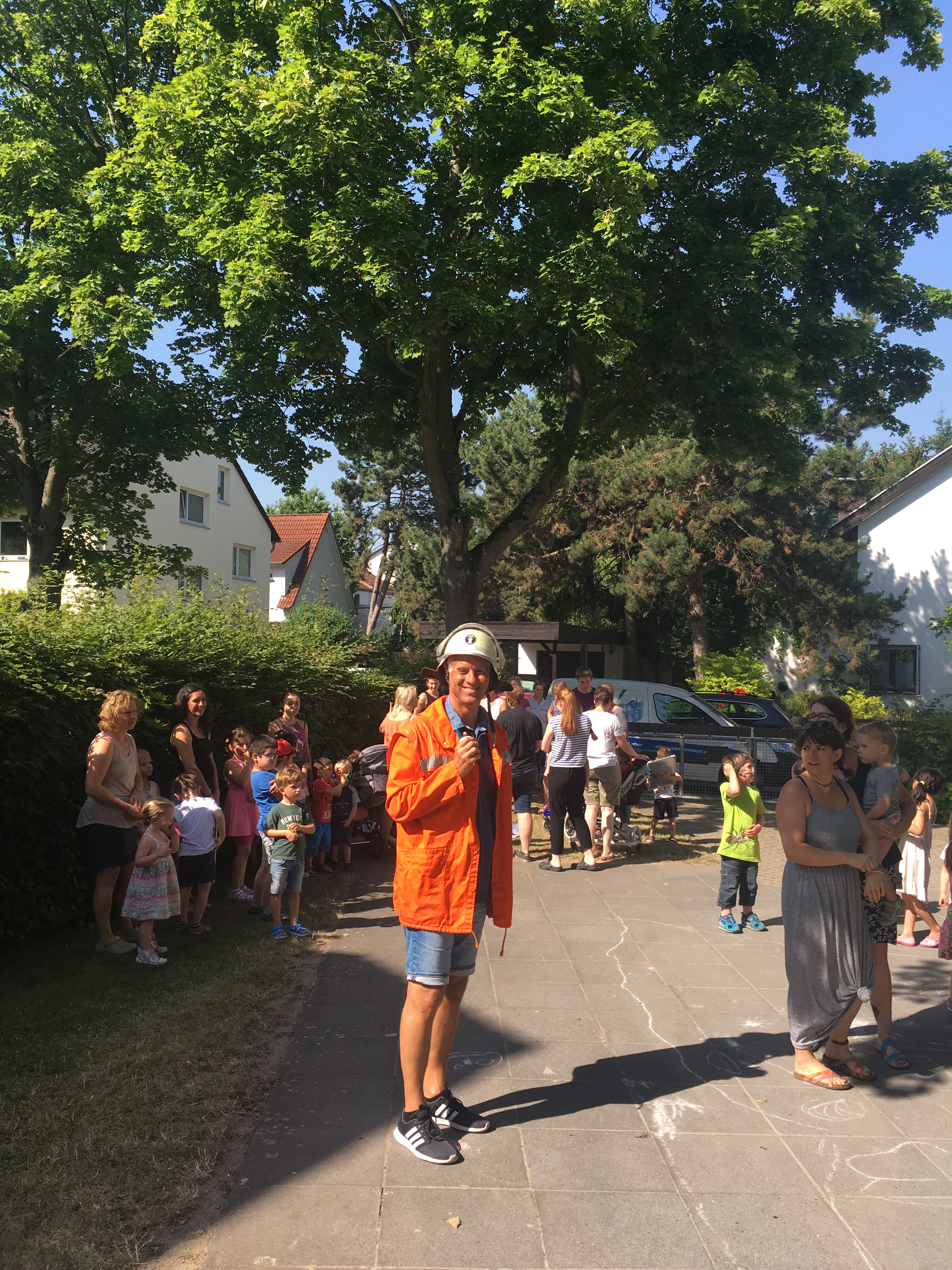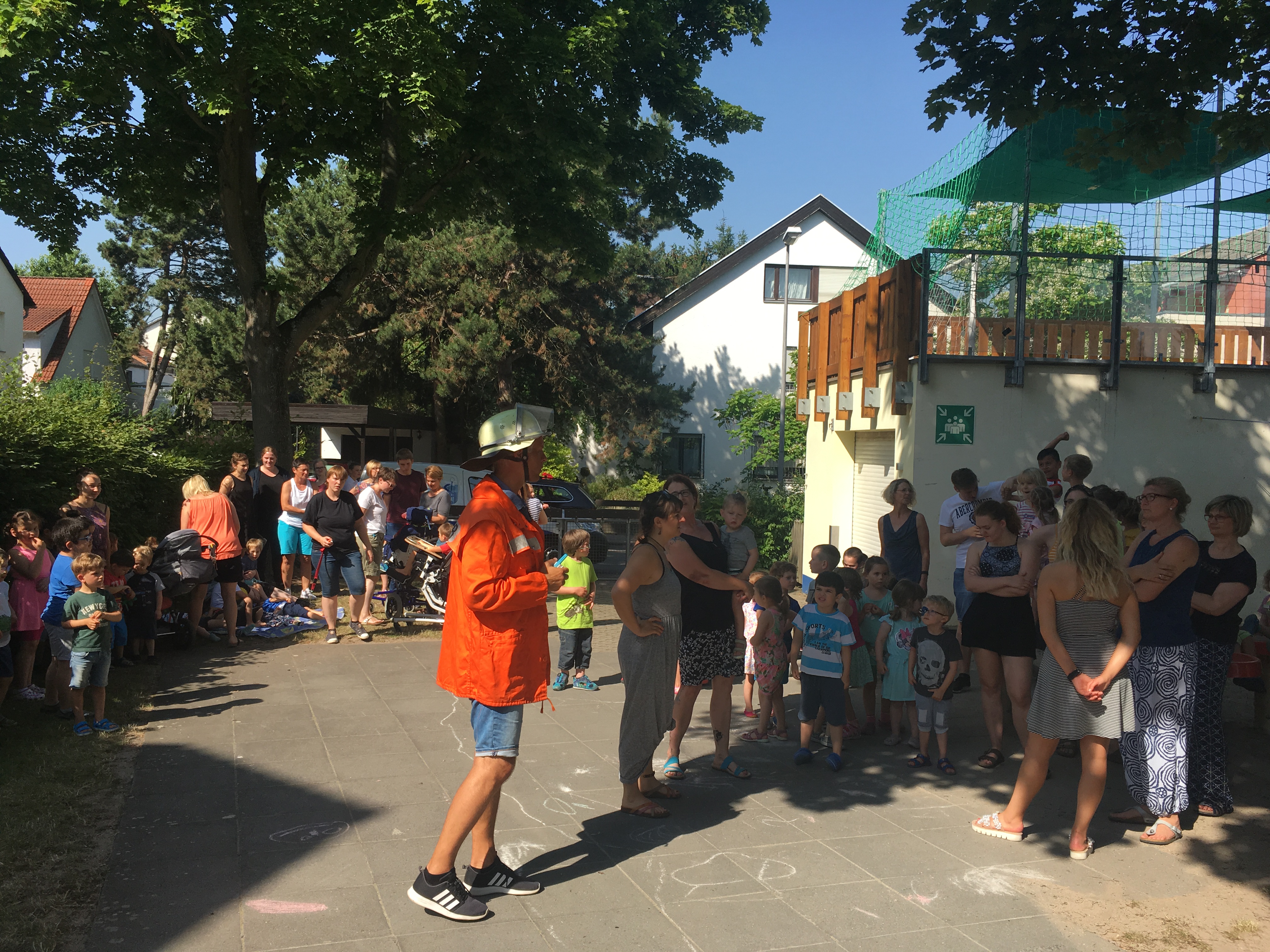 Authentisch wurde die Übung durch den "Feuerwehrmann" Sven Engel, den Geschäftsführer des Vereins und Leiter der Kita. Getopt wurde das Ganze als ein Feuerwehrauto und ein Rettungswagen mit Blaulicht vor die Kita fuhren.