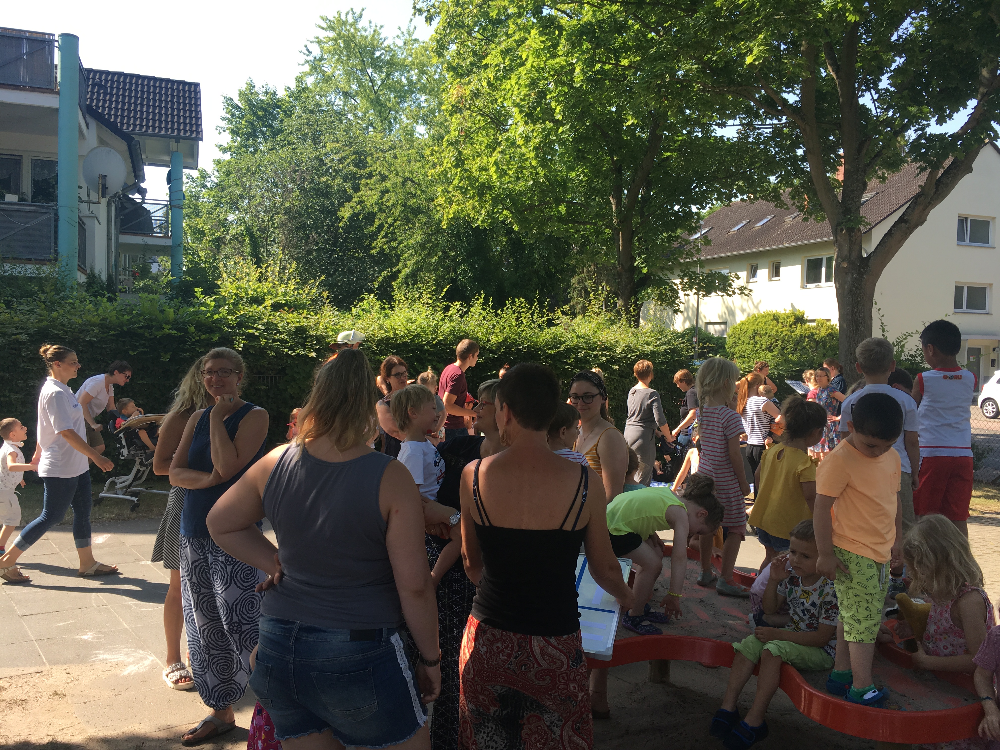 Nachdem ein Probealarm ausgelöst wurde, halfen alle Mitarbeiter/innen die Kinder in "Sicherheit" und zum zentralen Treffpunkt zu bringen. In wenigen Minuten war die Einrichtung geräumt.