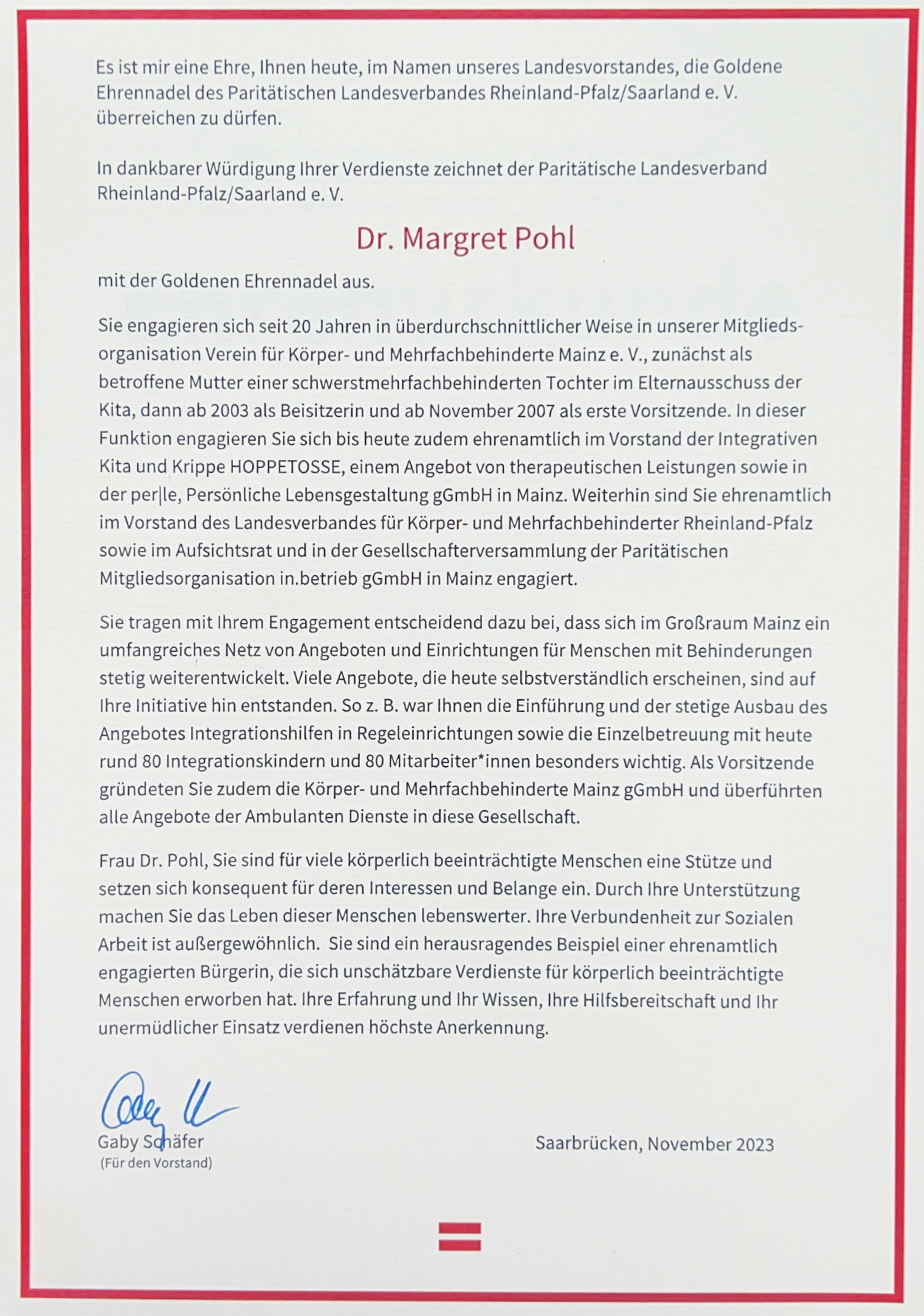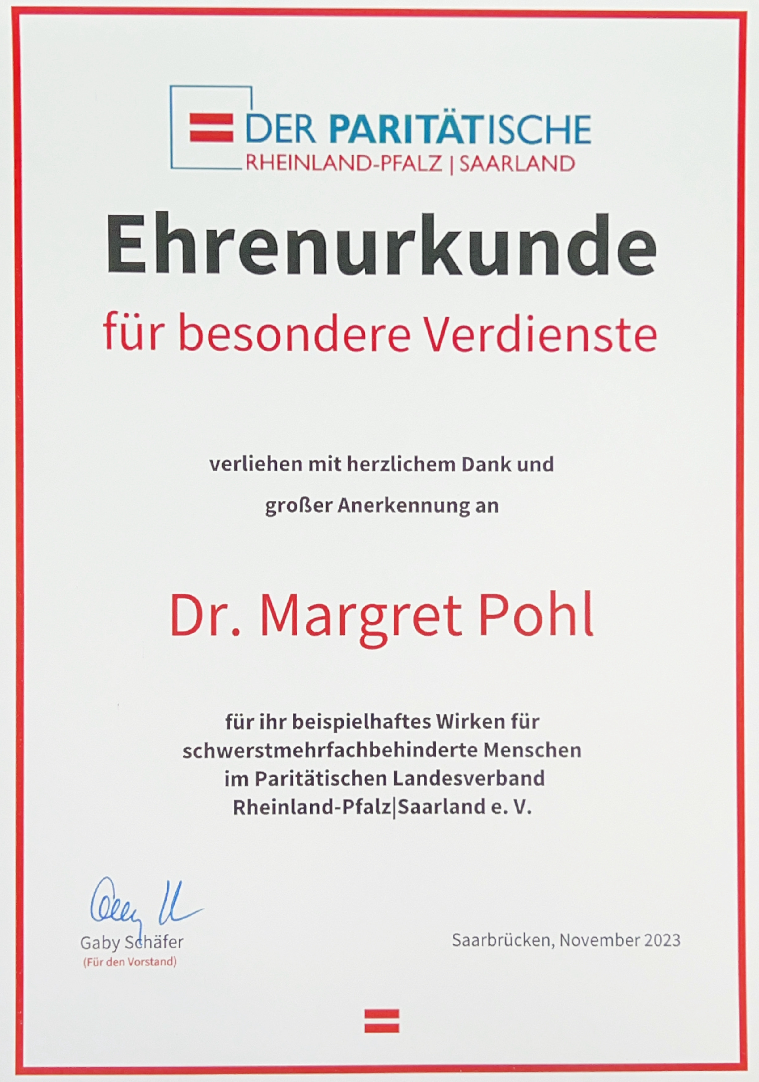 Im Rahmen seiner diesjährigen Mitgliederversammlung am 10.11.2023 hat der Paritätische unsere langjährige 1. Vorsitzende, Frau Dr. Margret Pohl, für ihr Engagement für Menschen mit Behinderung mit der Goldenen Ehrennadel ausgezeichnet.