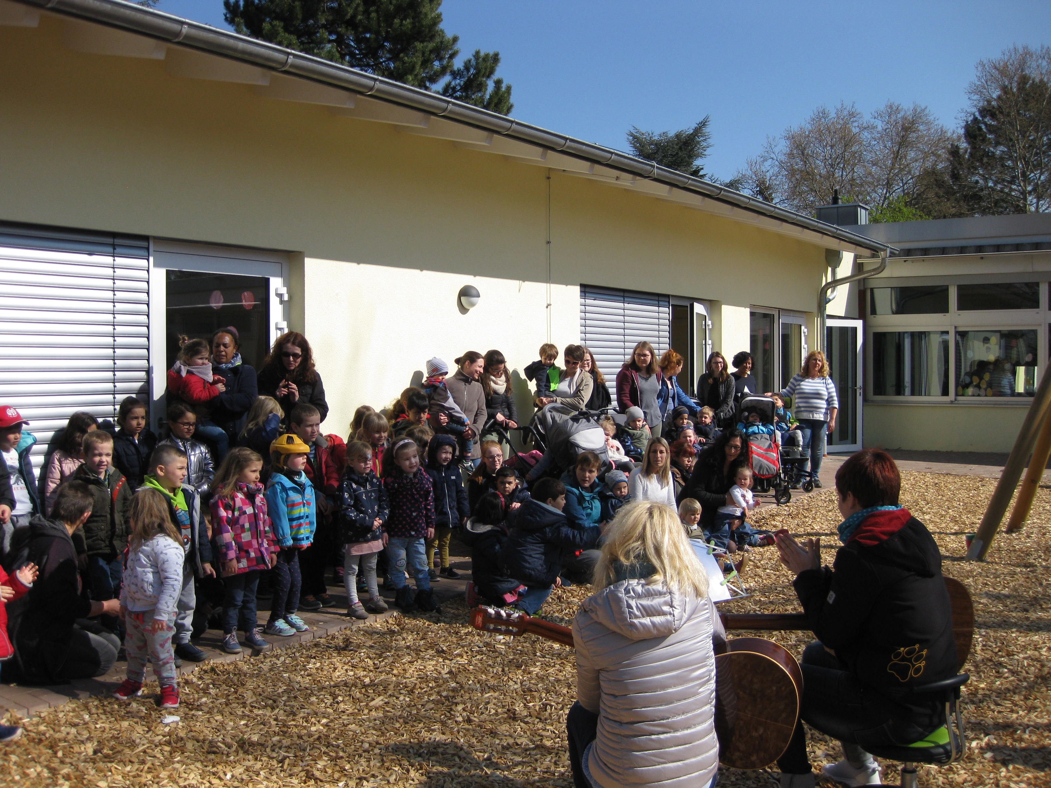 Der Verein hat hierzu zu einer kleinen Feierstunde eingeladen. Die Sonne lachte und so konnten alle Kinder unserer HOPPETOSSE den Gästen ihr Kindergartenlied im Garten präsentieren.