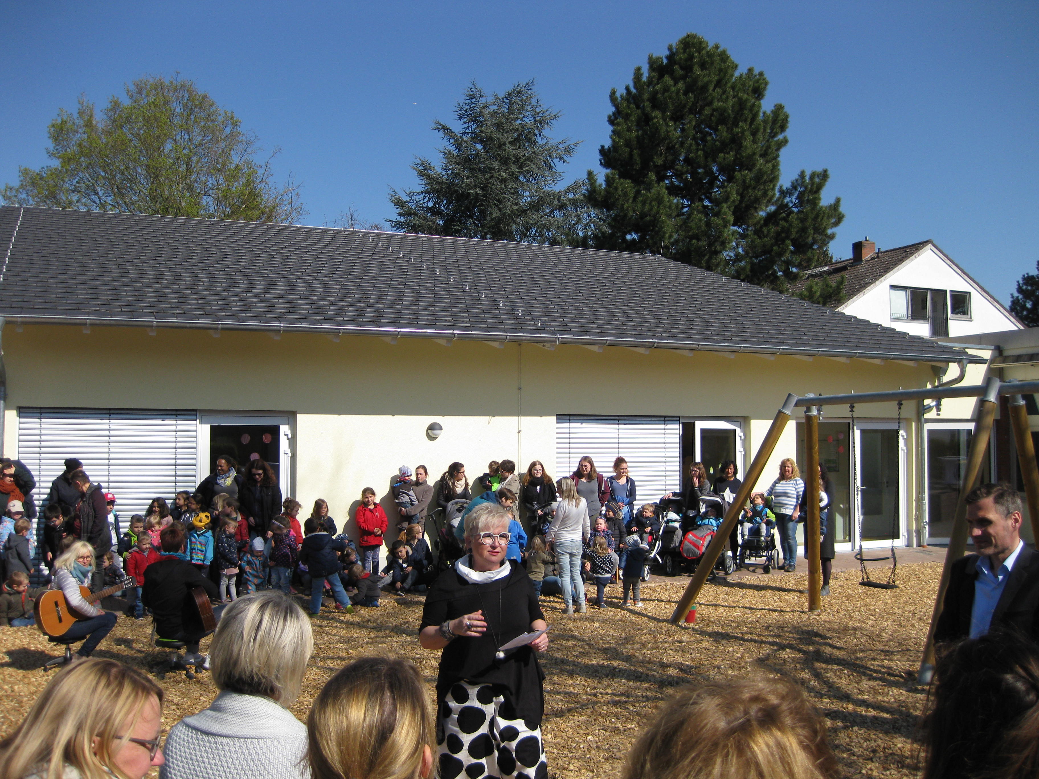 Frau Dr. Margret Pohl begrüßte als 1. Vorsitzende des Vereins die Gäste und lobte den Architekten Bardo Kleinschmitt für die gute Planung und Betreuung während der Bauzeit. Gleichzeitig dankte sie den Mitarbeiter/innen der Kita, die die Bauphase mit den entsprechenden Einschränkungen mitgetragen haben.