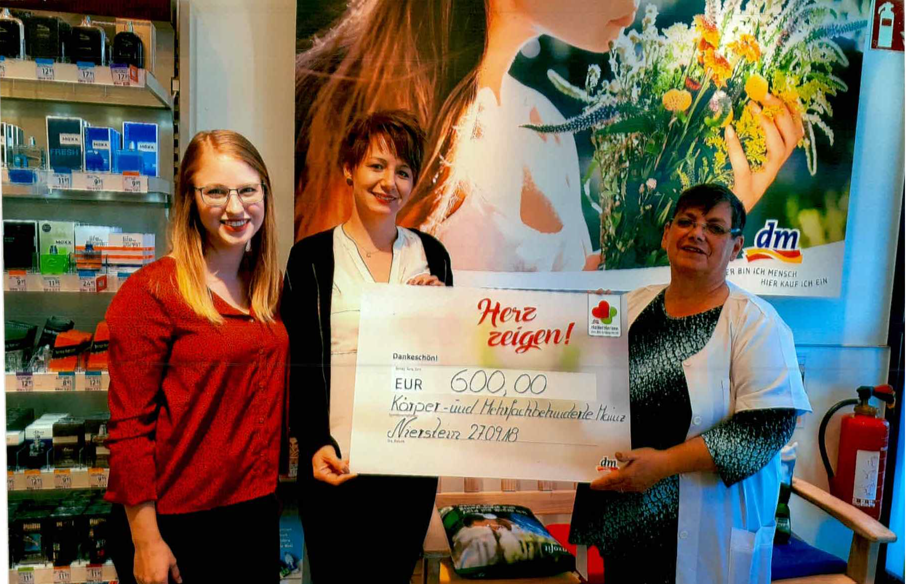 Die Spenden Aktion "Herz zeigen" des dm Marktes in Nierstein ist nun beendet. Die Körper- und Mehrfachbehinderten Mainz gGmbH erreichte den ersten Platz und wir erhielt eine Spende über 600€ für unsere gemeinnützige Einrichtung. Wir danken Frau Kloos sowie allen MitarbeiterInnen des dm Marktes Nierstein für die freundliche Kooperation.