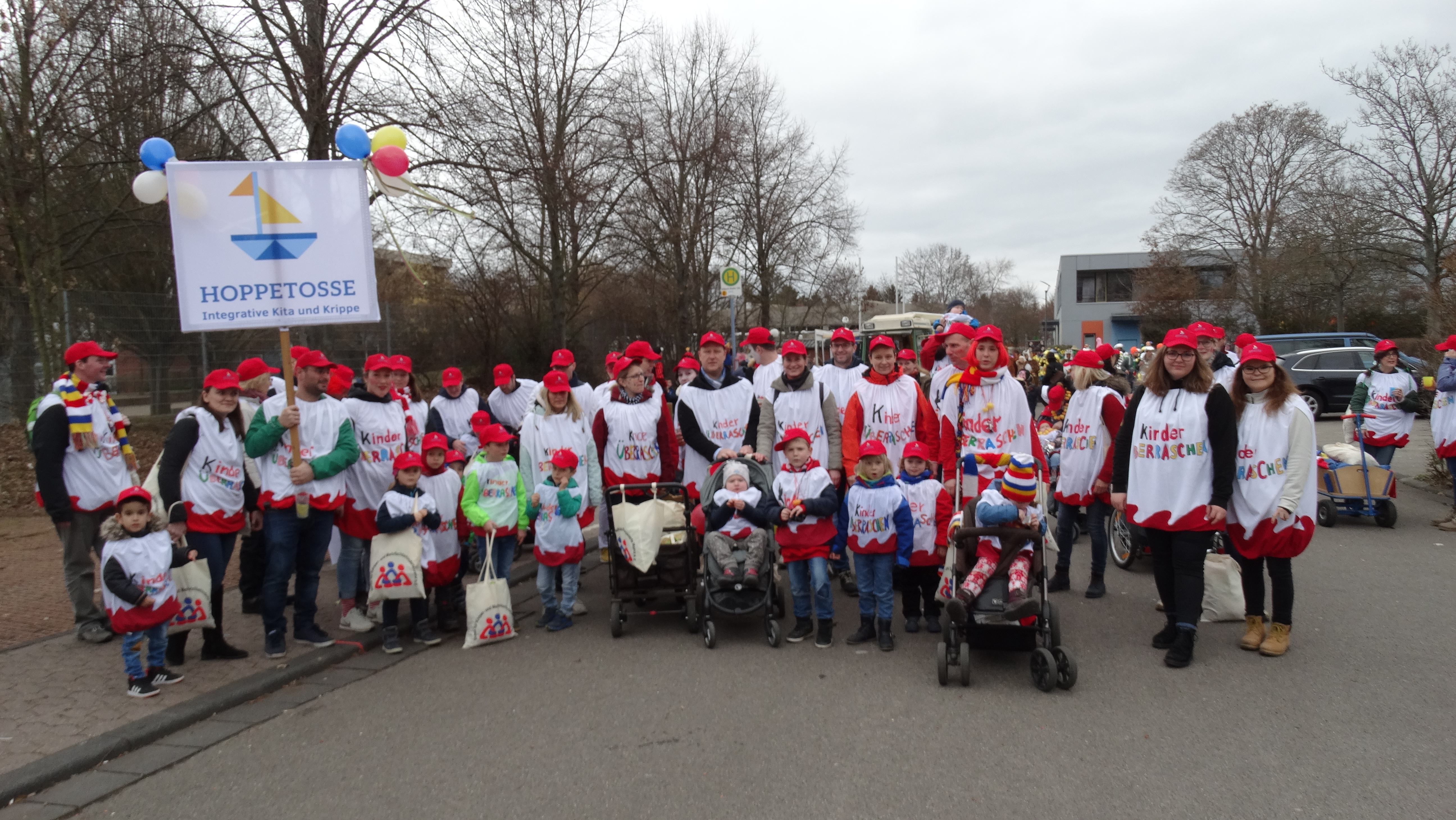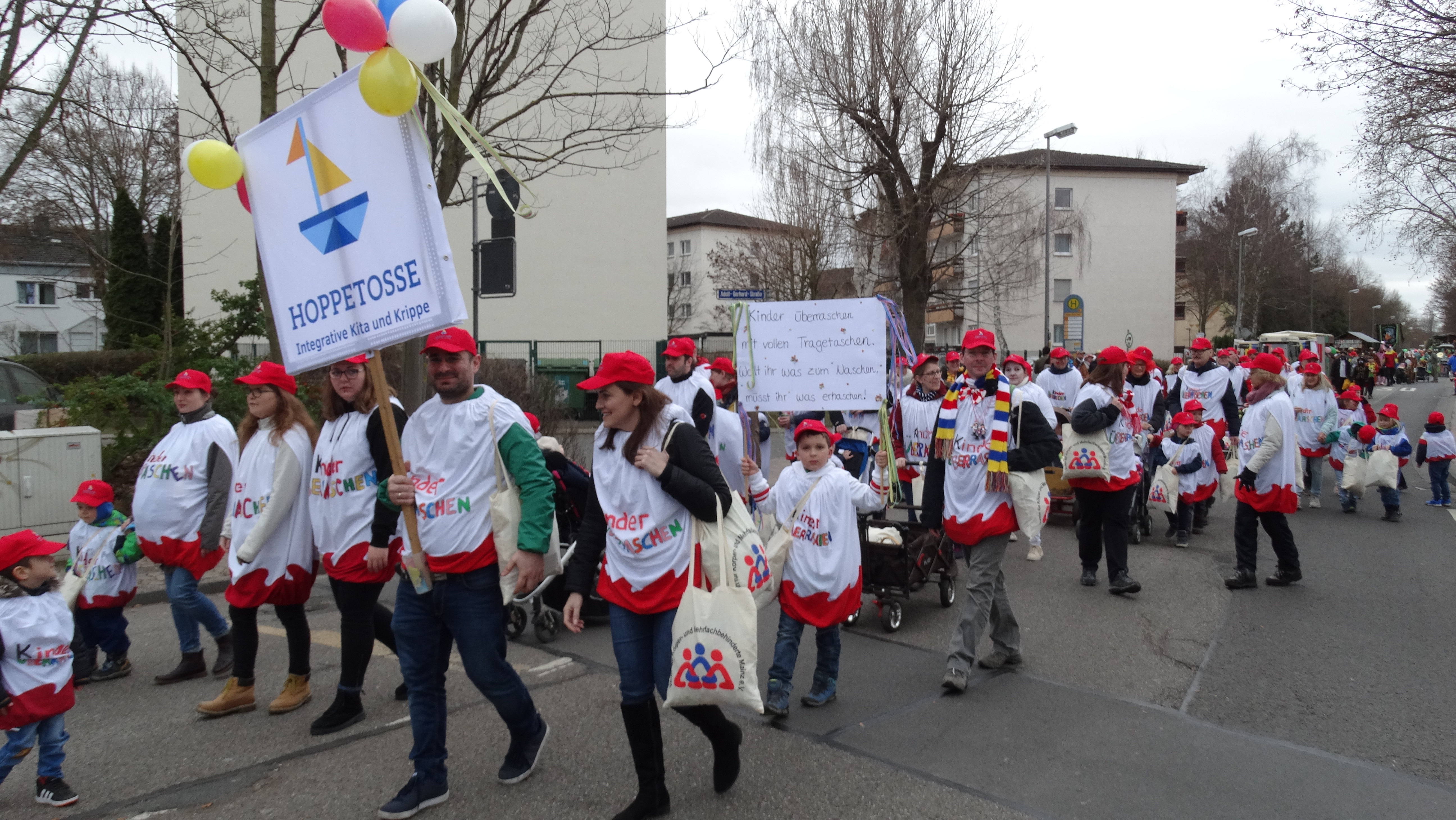 Rund 60 Kinder, Eltern und Mitarbeiterinnen unserer integrativen Kita und Krippe HOPPETOSSE sind als Überraschungseier verkleidet beim Fastnachtsumzug durch Mainz-Bretzenheim gezogen.