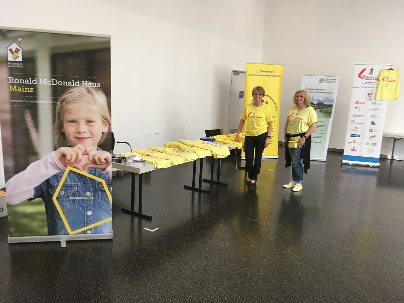 Auch bei der Marathonmesse in der Rheingoldhalle wird auf die Charity-Aktion aufmerksam gemacht. An einem eigenen Verkaufsstand werden "Lebenslauf-T-Shirts" - jedes Jahr in einer neuen Farbe - gegen eine Spende an die Frau bzw. den Mann gebracht.