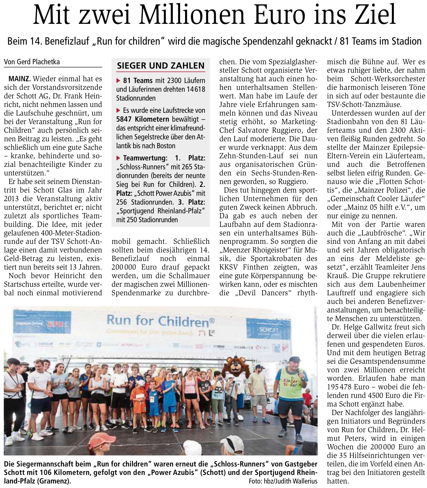 Letztendlich schafften es die 2.300 Läufer 195.478,-- € zu "erlaufen". Die bis zu 2 Millionen Marke fehlenden 4.500,-- € schießt die Firma Schott dazu, so dass es allen gemeinsam gelang, die magische Zahl zu knacken.