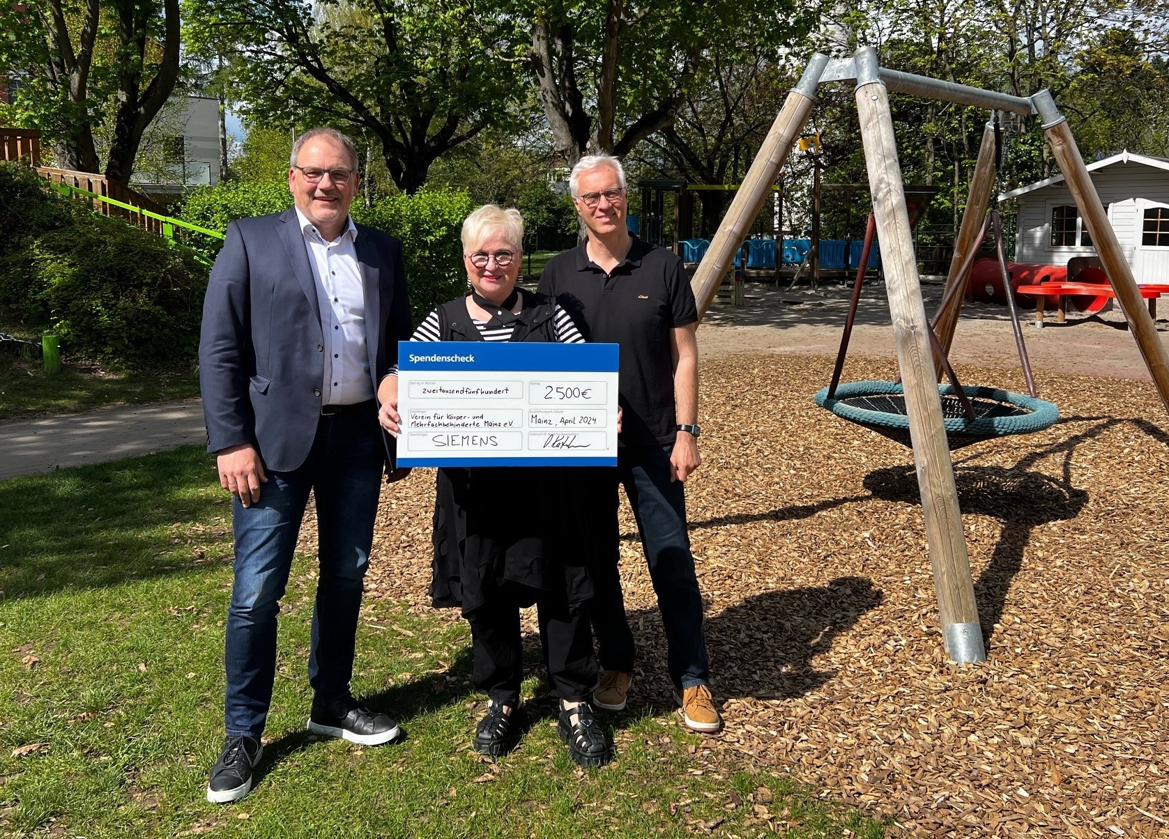 Die Siemens-Niederlassung Mittelrhein unterstützt den Verein für Körper- und Mehrfachbehinderte Mainz e.V. mit einer Jahresspende in Höhe von 2.500 Euro. Die Spende übergab der Sprecher der Niederlassung Olaf Katzorke an Sven Engel, Geschäftsführer des Vereins, und Dr. Margret Pohl 1. Vorsitzende des Vereins. Die Spende wird für die Sanierung der Kita und Krippe HOPPETOSSE verwendet und das Geld für einen Sonnenschutz eingesetzt werden.