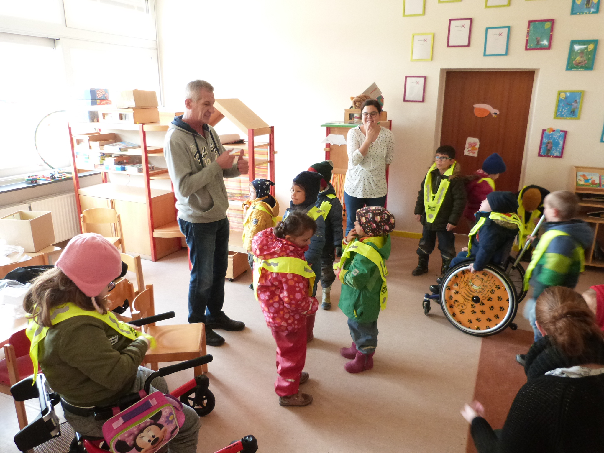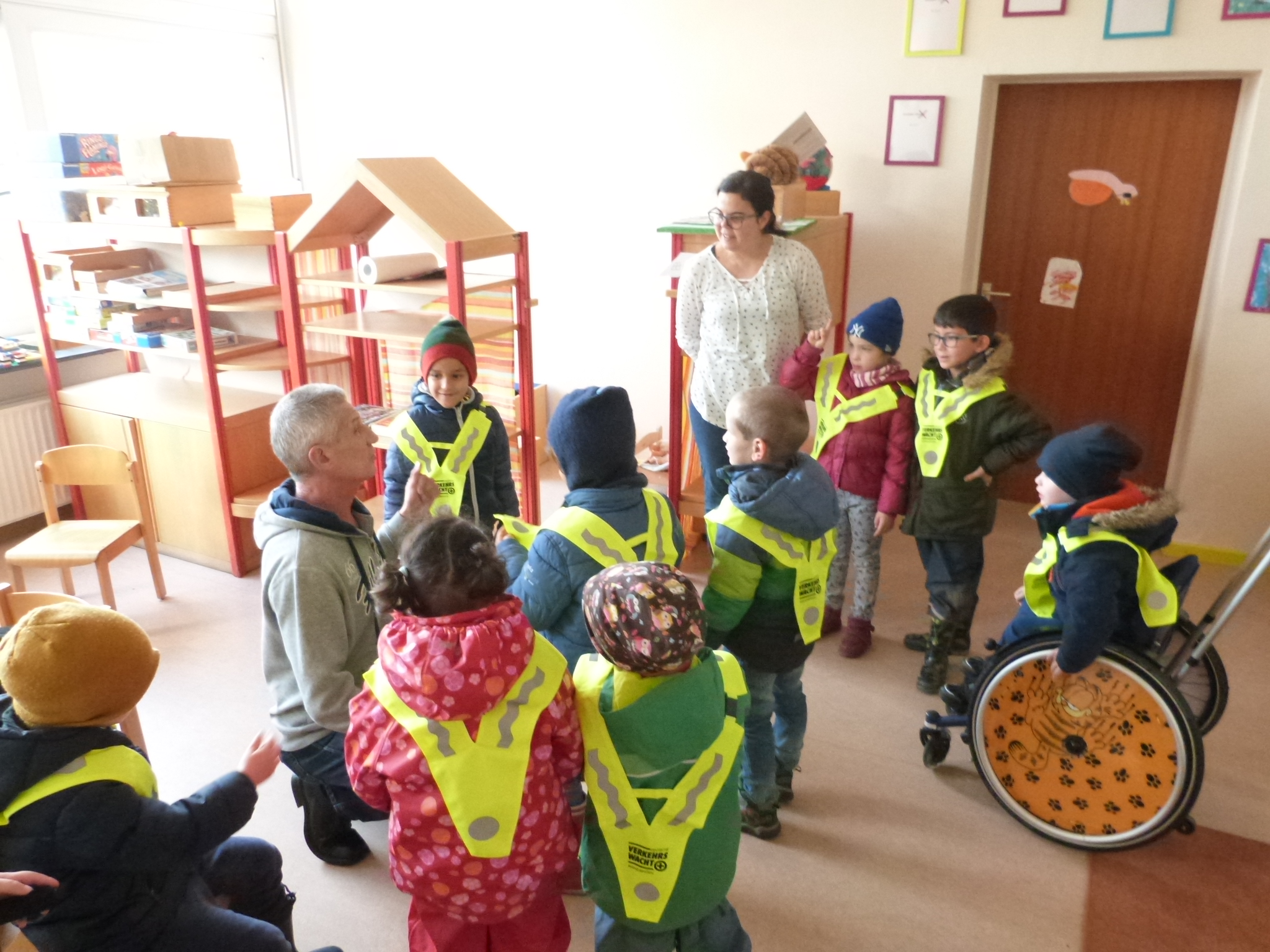 Dazu hat uns die Verkehrswacht e.V. einen Satz gelber Warnwesten geschenkt, mit denen die Kindergartengruppen im Straßenverkehr besser gesehen werden.