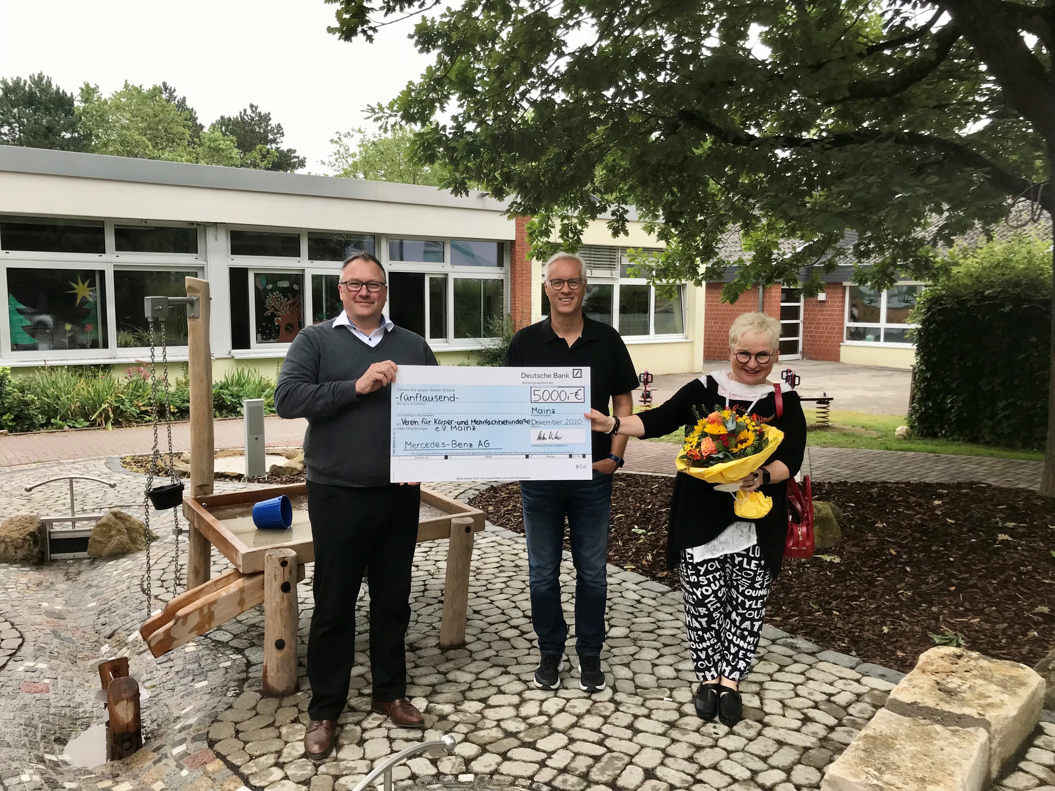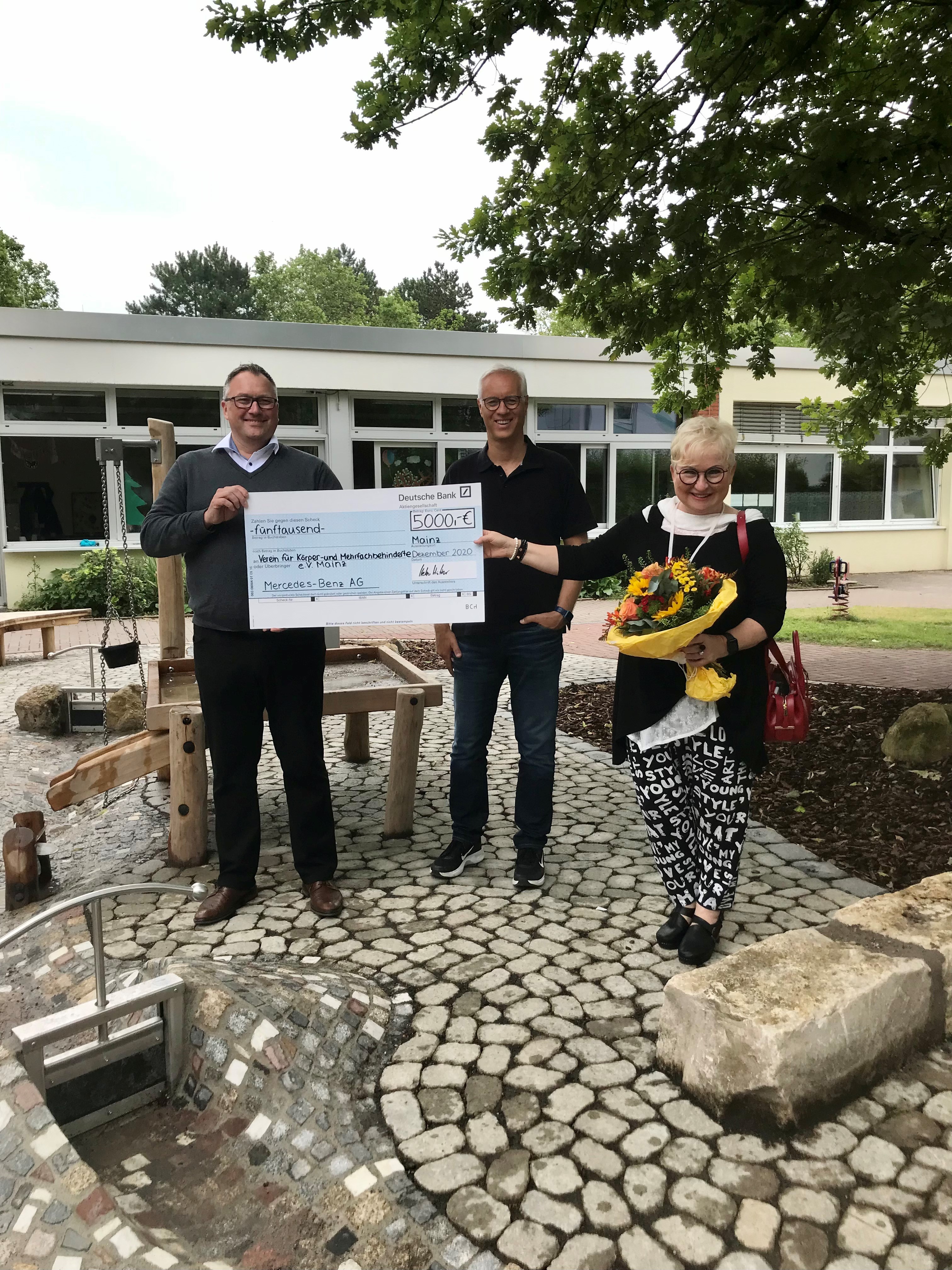 Bereits im letzten Jahr hat die Mercedes-Benz Niederlassung Mainz dem Verein für Körper- und Mehrfachbehinderte Mainz e.V. einen Betrag von 5.000,-- € gespendet. Aufgrund der Coronapandemie war eine offizielle Übergabe der Spende allerdings erst jetzt möglich. Zwischenzeitlich konnte die Wasserlandschaft, für die die Spende vorgesehen war, auf dem Gelände der integrativen Kita und Krippe in Mainz fertiggestellt werden. "Wir freuen uns sehr, mit unserer Spende einen Beitrag zu diesem wertvollen Projekt des Vereins für Körper- und Mehrfachbehinderte Mainz e.V. leisten zu können", so Heiko Hüttner, Centerleiter der Mercedes-Benz Niederlassung Mainz. Der Verein für Körper- und Mehrfachbehinderte Mainz e.V. ist ein gemeinnütziger Verein, der es sich zum Ziel gesetzt hat, Menschen mit Behinderungen bessere Lebenschancen zu bieten. Dr. Margret Pohl, 1. Vorsitzende des Vereins, und Sven Engel, Geschäftsführer des Vereins und Leiter des integrativen Kindergartens, bedanken sich für die großzügige Unterstützung der Mercedes-Benz Niederlassung Mainz.